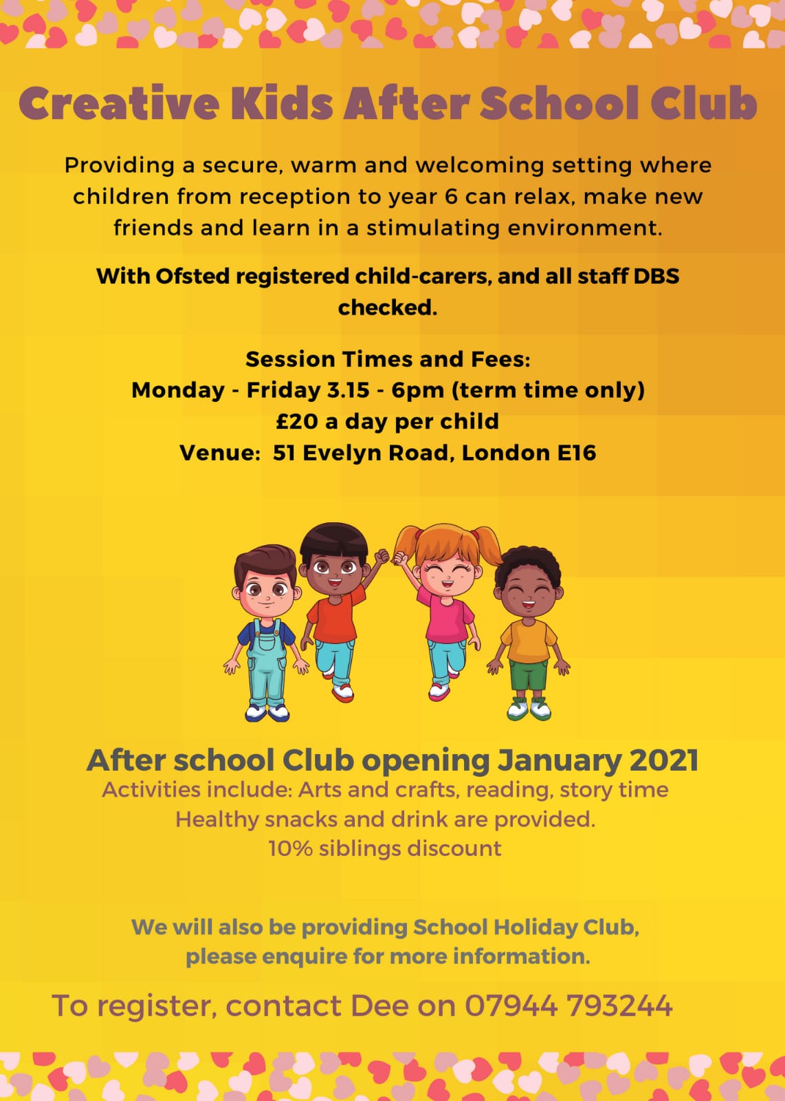 ‘Creative Kids’ after school care is provided opposite the school in the Community Dock by Dee Addo and Sarah Boampong, experienced child minders. For more details and contact information please open the leaflet below.